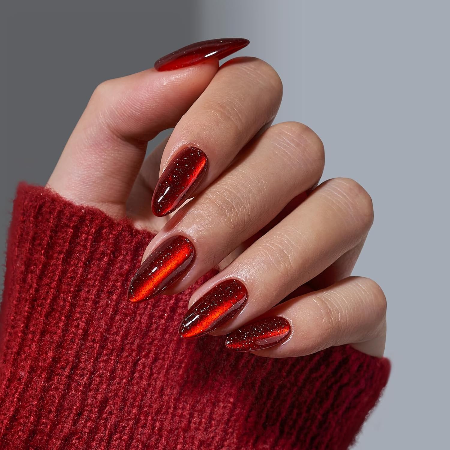 BTArtbox Press On Nails Almond – Deep Red Sparkly Stick on Nails for Christmas, Glossy Fake Nails Medium in 15 Size, 30 Nail Kit, Mystic Ruby